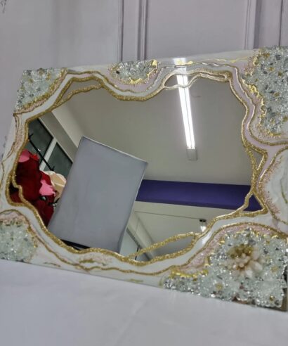 Αυτός ο εντυπωσιακός καθρέφτης δεν είναι απλώς ένα διακοσμητικό στοιχείο—είναι μια εμπειρία! Δημιουργημένος με υγρό γυαλί, κρύσταλλα και ημιπολύτιμους λίθους, αποπνέει κομψότητα και μοναδικότητα.