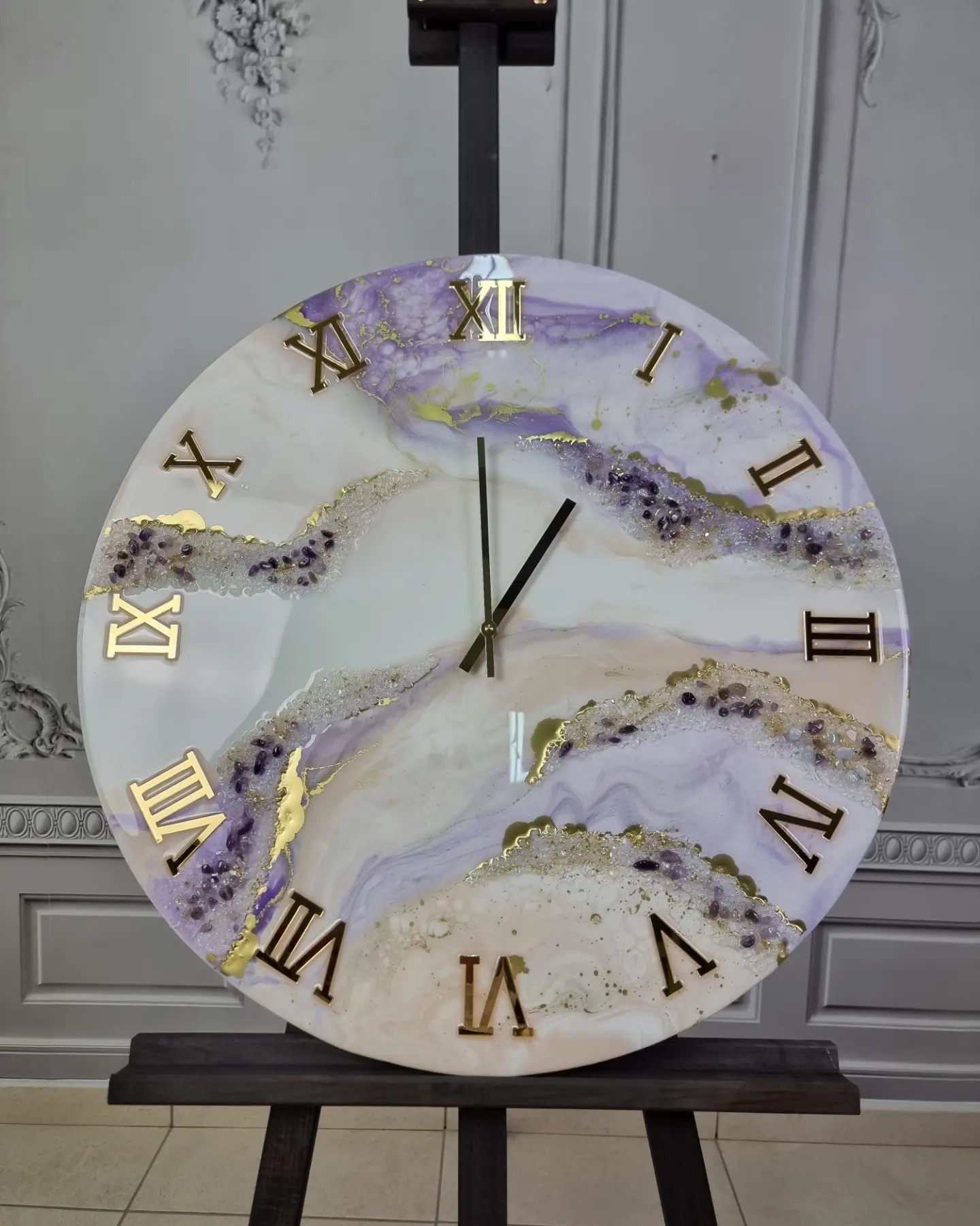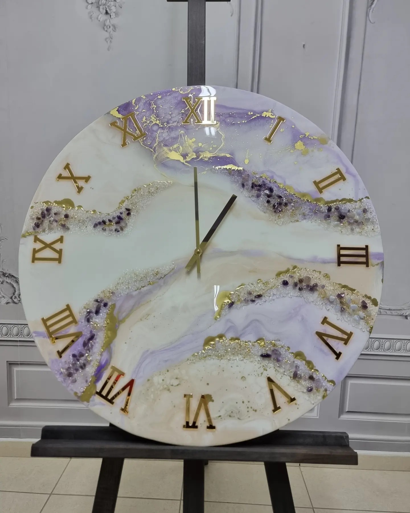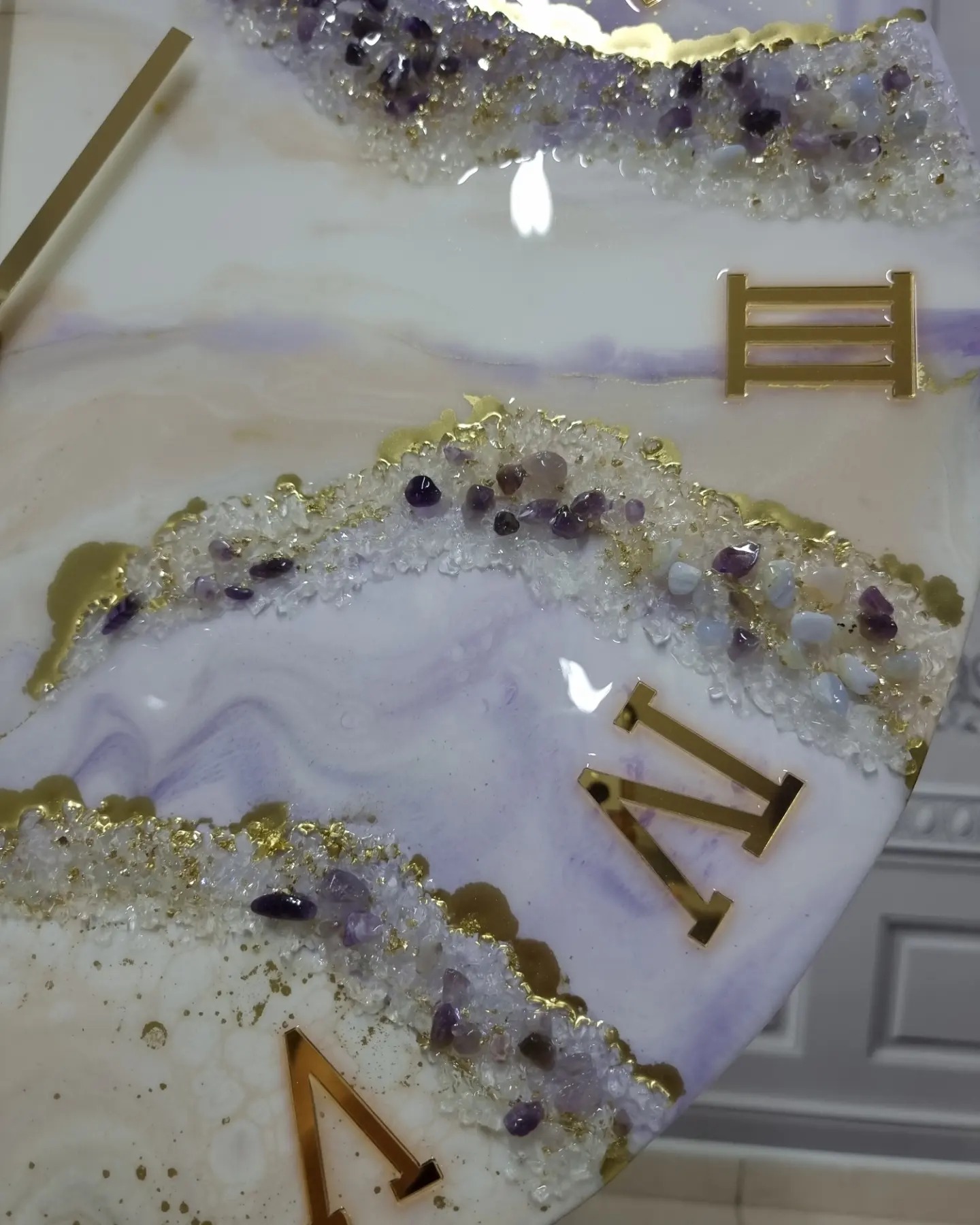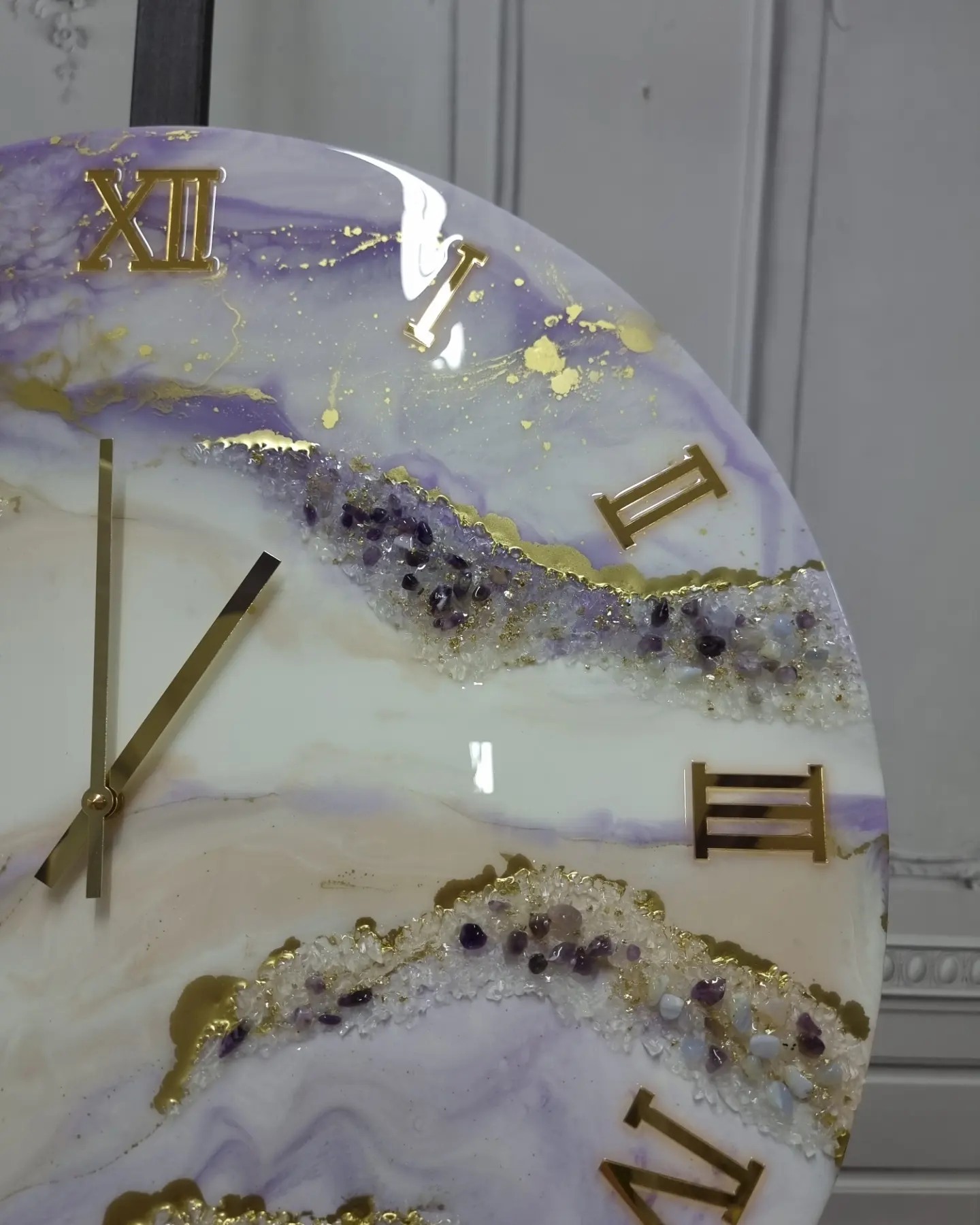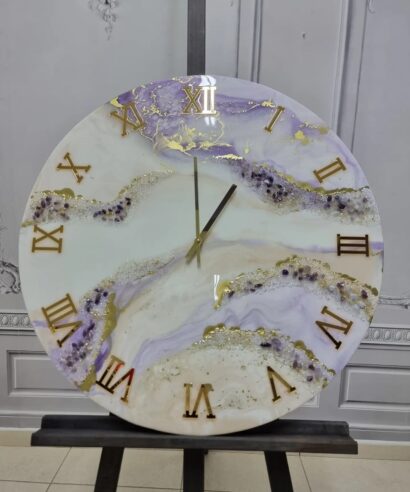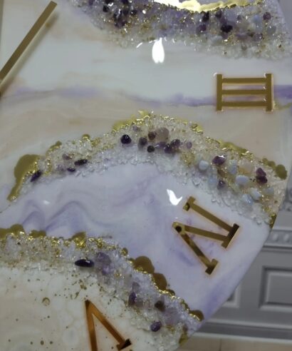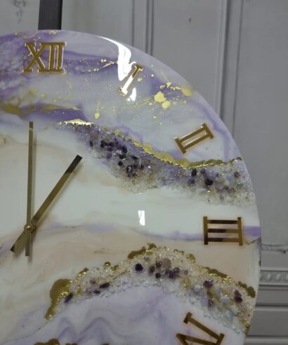 Ρολόι Τοίχου με επιφάνεια από υγρό γυαλί, κρύσταλλα και ημιπολύτιμους λίθους Αμέθυστος