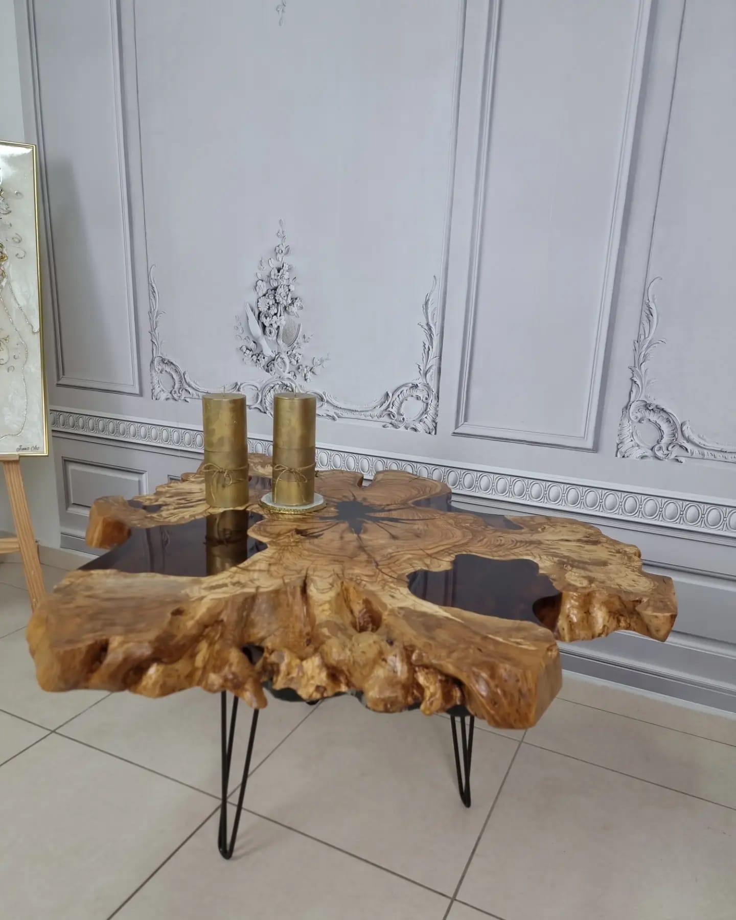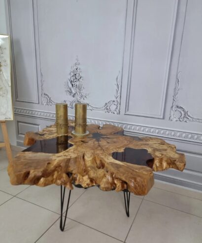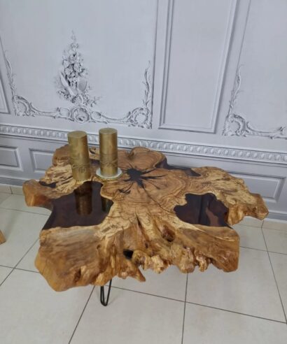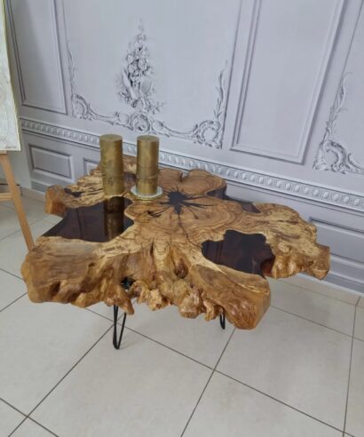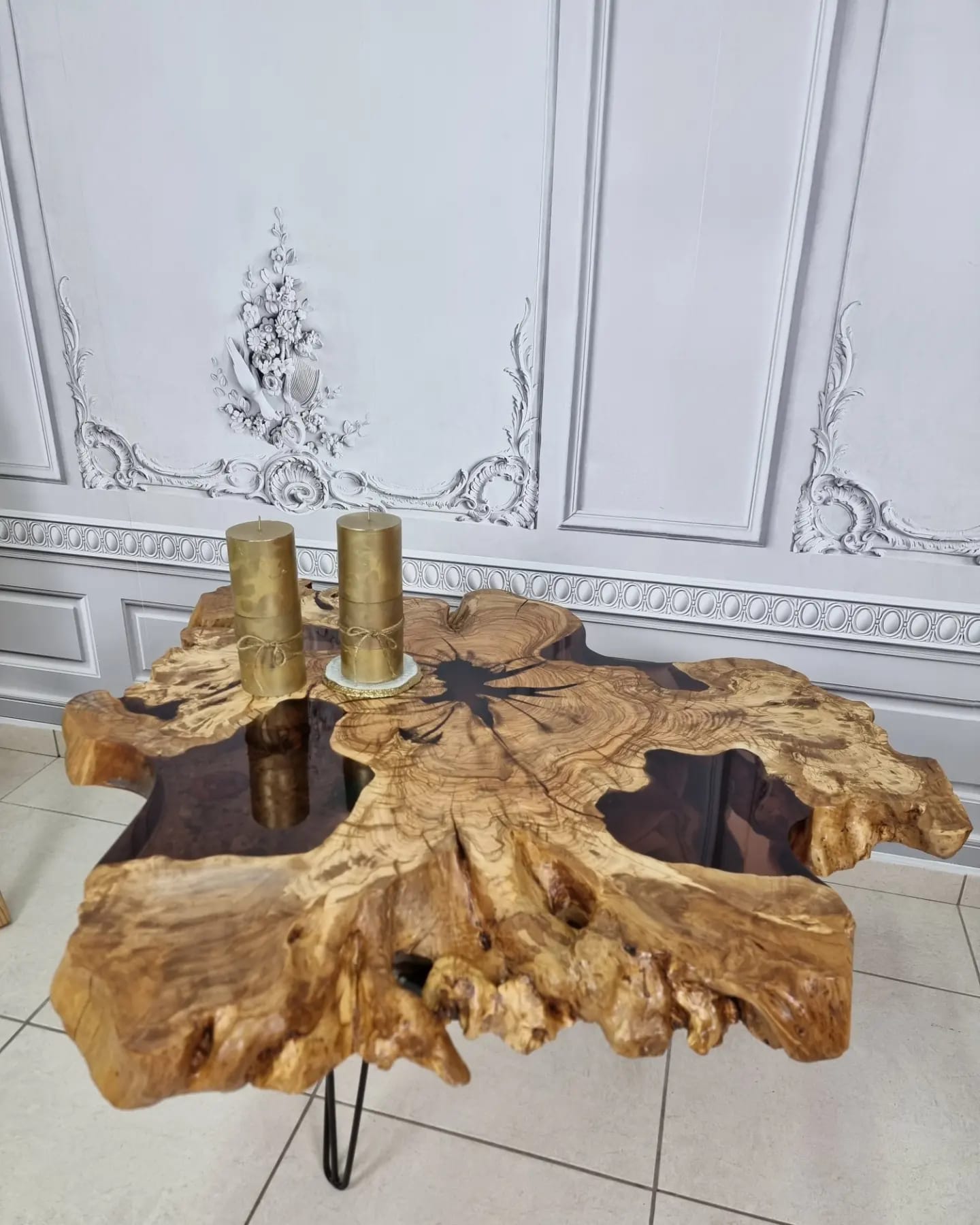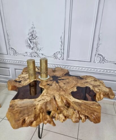 Χειροποίητο ξύλινο τραπέζι διαστάσεων 110Cm*90cm*46cm.Είναι φτιαγμένο με ρίζα ξύλου από γέρικη ελιά ενωμένα με ρητίνη σε αποχρώσεις του καφε.To τραπέζι είναι επεξεργασμένο με κερί στην επιφάνεια του δίνοντάς του την μοναδική του όψη .Το υλικό των ποδιών του είναι σίδερο και ειναι σε ύψος 46cm .Δεχόμαστε και τις δικές σας παραγγελίες στις διαστάσεις και αποχρώσεις που επιθυμείται!
