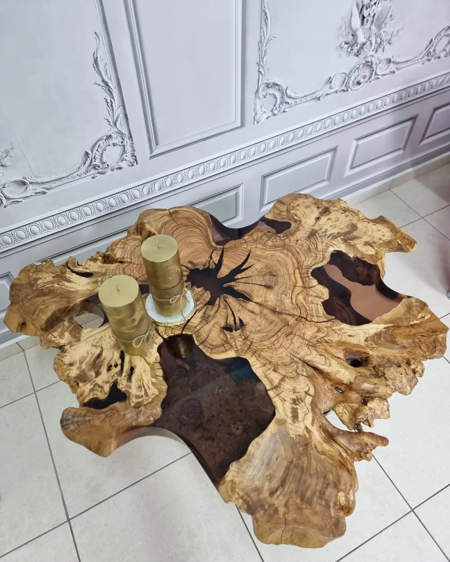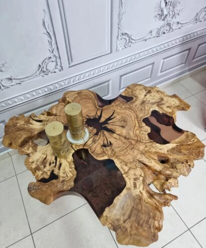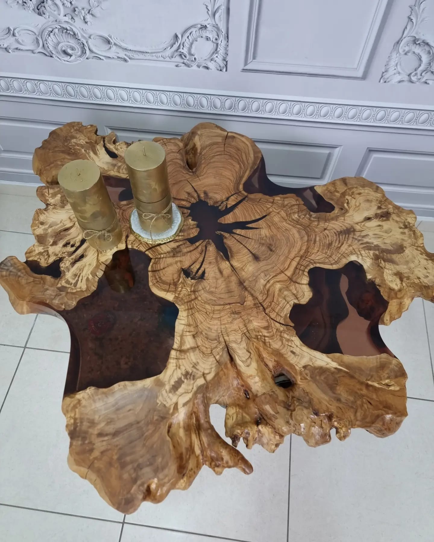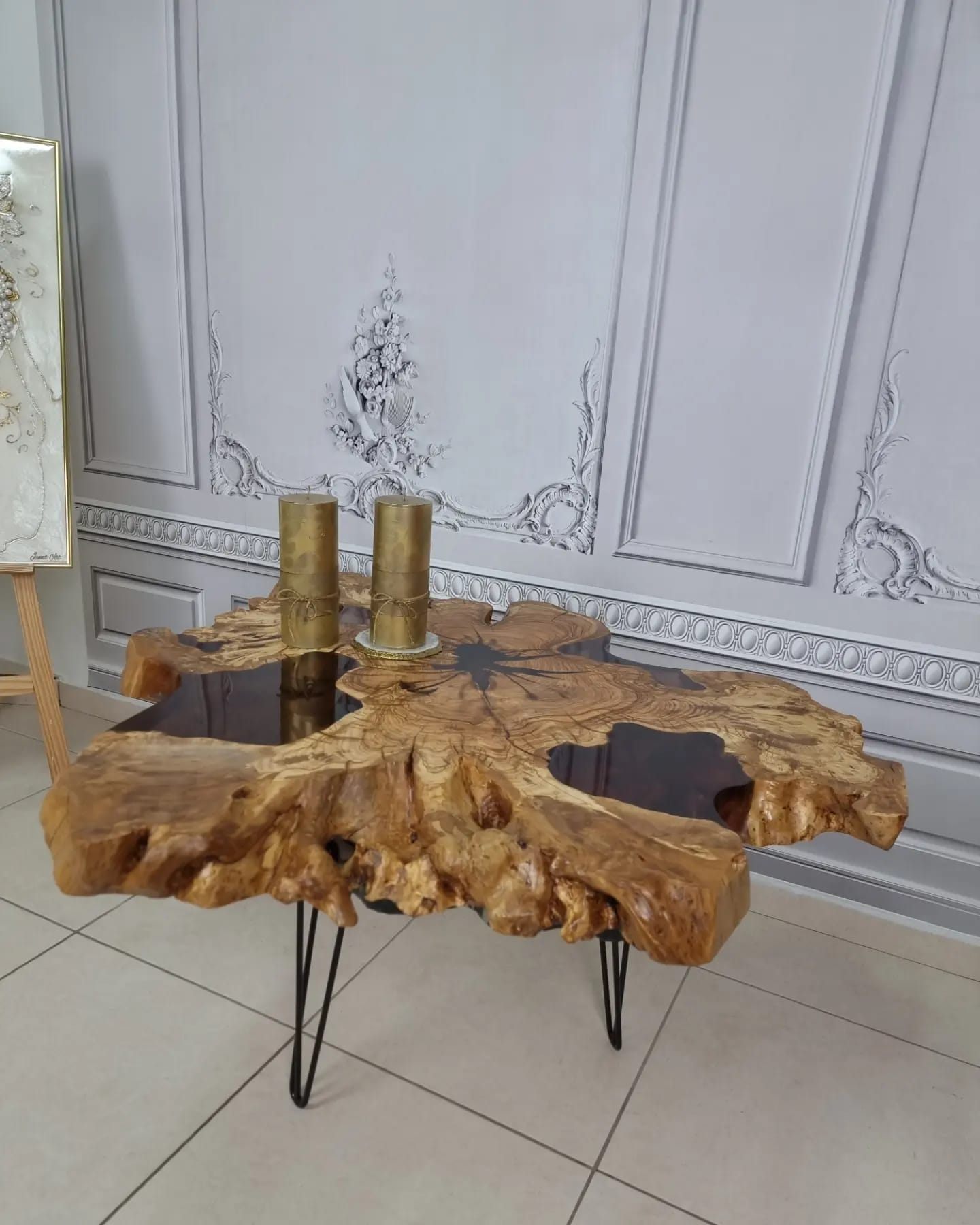 Χειροποίητο ξύλινο τραπέζι διαστάσεων 110Cm*90cm*46cm.Είναι φτιαγμένο με ρίζα ξύλου από γέρικη ελιά ενωμένα με ρητίνη σε αποχρώσεις του καφε.To τραπέζι είναι επεξεργασμένο με κερί στην επιφάνεια του δίνοντάς του την μοναδική του όψη .Το υλικό των ποδιών του είναι σίδερο και ειναι σε ύψος 46cm .Δεχόμαστε και τις δικές σας παραγγελίες στις διαστάσεις και αποχρώσεις που επιθυμείται!